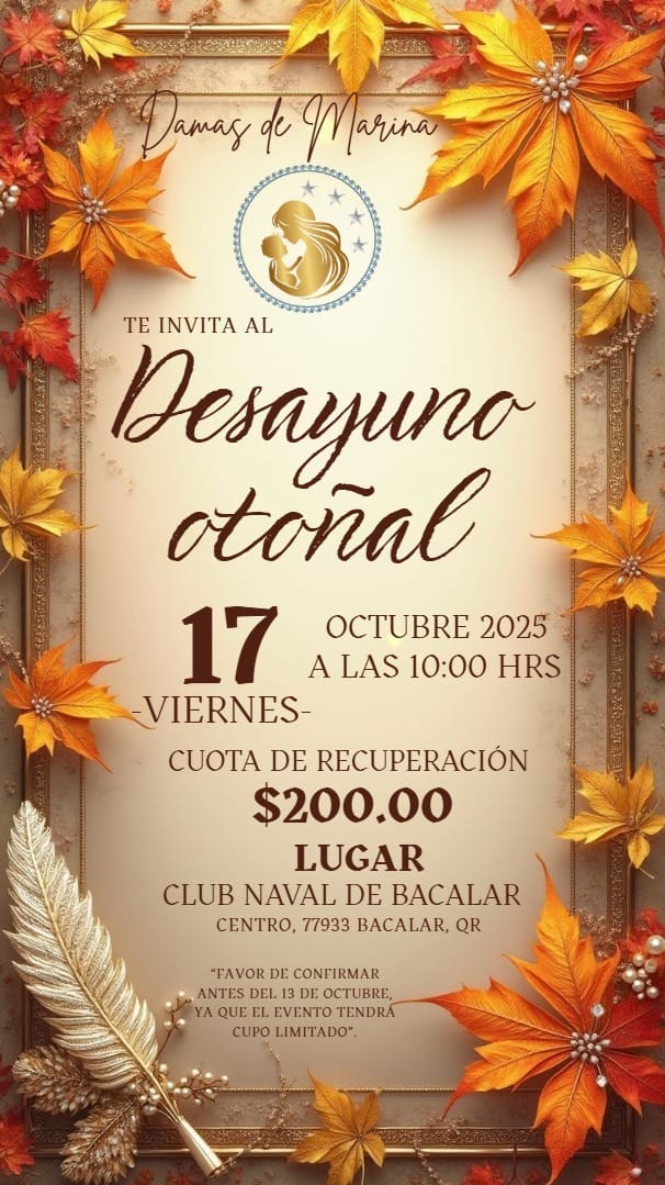 Las Damas de Marina de Chetumal tenemos el gusto de saludarles e invitarles cordialmente, a usted y a su distinguido grupo, a nuestro Desayuno Otoñal, que se llevará a cabo el