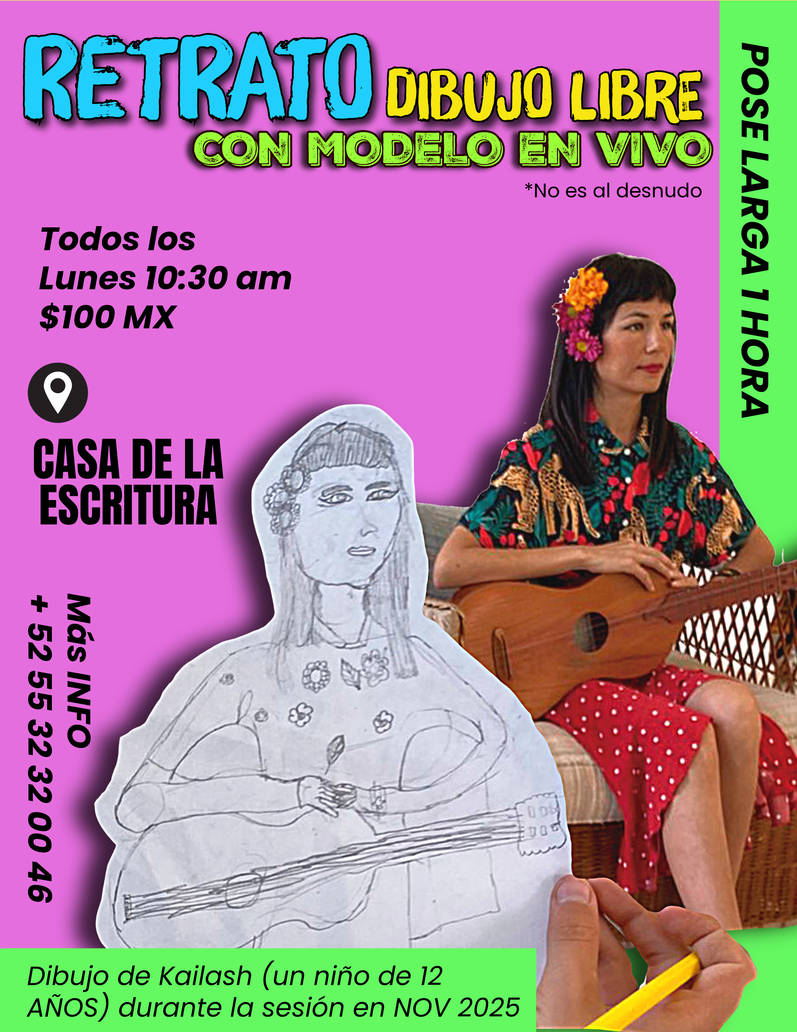 Nos juntamos a dibujar a una persona modelando en VIVO en una pose LARGA duración de 60 minutos divididos en 4 bloques de 15 minutos. Sesión de dibujo libre (cada quien dibuja lo que quiere y puede). No se necesita saber dibujar. LIFEMODEL JAM Portrait session. More info WP al 55 32 32 00 46